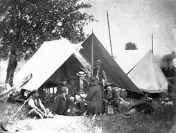 | Communicating During the Civil War, telegraph corps followed troops and erected poles and wires to provide communication from the battle front. A group of military telegraph operators is shown above. Poles carrying the telegraph wires can be seen leading into the distance. See related story |